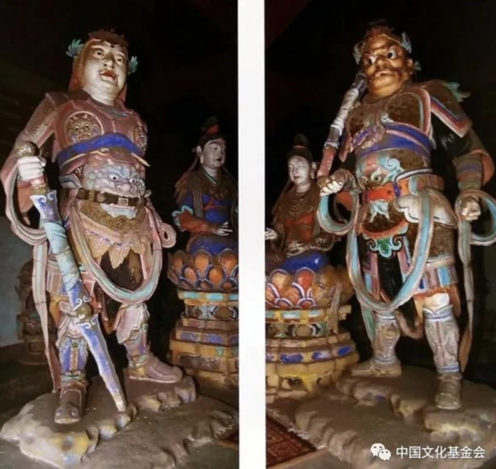 天王像是宋碑中提到的“善神”,即武土像。天王为佛国护法军团(天龙八部)之首,因身份尊贵,常着甲胄。现国内存世的唐宋胁侍天王多数未执武器,圆觉殿内的原塑天王即如此,2002 年修复时可能误认为金刚而加上了金刚杵。其中东侧护法天王胸挺腰拧,腿倾肩仰,怒目张鼻,手掌宽厚,处处阳刚,充满劲力,神威生动。