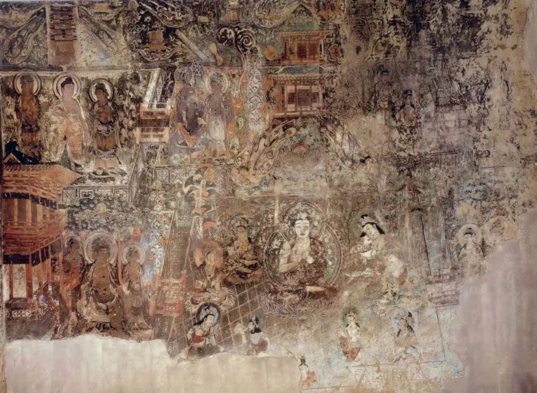 中央主体画面,平台上,正中为阿弥陀佛于树下讲法,四周疏疏落落地分布着八位坐于琉璃地面之上的菩萨,姿态各异:或胡跪持花,或合十盘坐,或盘腿支腮沉思,或看着自己的手印出神。绘画线条疏密有致、稳健有力,色彩浓淡变化艳而不俗,把这些人物的精神气质清晰刻画而出,也体现了净土世界的自由、闲暇、舒适。虽然这幅壁画曾被熏黑,但在上世纪70年代,通过敦煌研究院的保护专家们精心修复,使其唐时的状态得以还原。