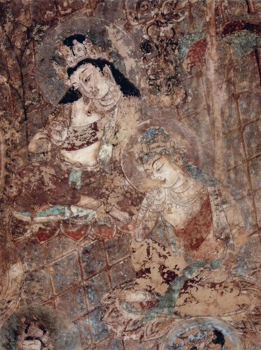 第71窟壁画《西方净土变》中的两位思惟菩萨,位于阿弥陀佛座侧(壁画右半部分)。较上面一位思惟菩萨,头戴宝冠,梳高髻,黑发分披双肩,交脚趺坐于伏瓣莲上,身姿扭向一边,右手打着手印,眼望自己的手印,默默出神。