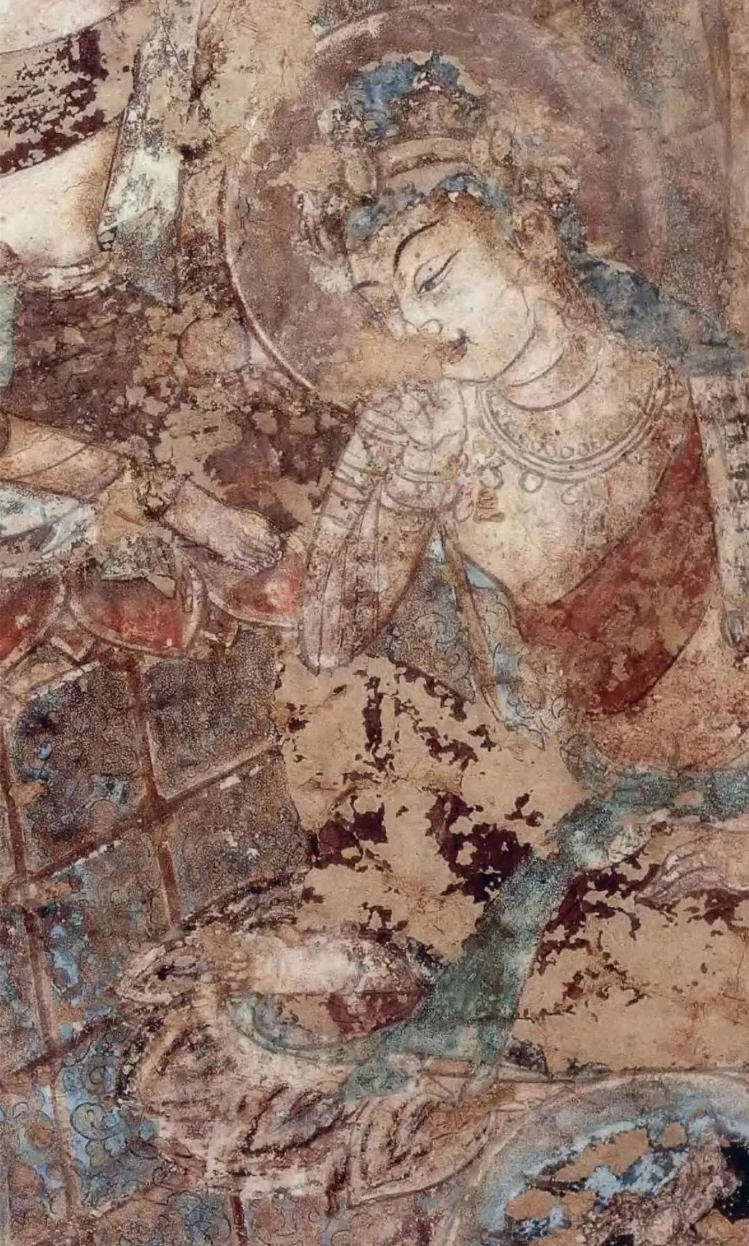 右侧中间这位思惟菩萨,坐于莲花座上,面容姣好,宝蓝色的长发及肩,右手托腮,支颐沉思。左腿弯曲平放,左手很自然地放在膝盖上,右小腿立起;右肘撑在膝盖上,右手食指放在嘴边,显得很随意轻松。这位菩萨的面部显得非常清晰,披肩长发是蓝色的。这种蓝是用蓝色的青金石画出来的,就是把蓝宝石直接磨成粉末。青金石是经丝绸之路从阿富汗传入中国的,那时比黄金都要贵。这种颜料在莫高窟早期壁画里用得比较多,画出来的颜色经久不变,现在去洞窟看都像刚刚画出来的一样,保存得特别好。