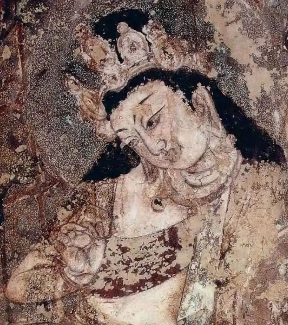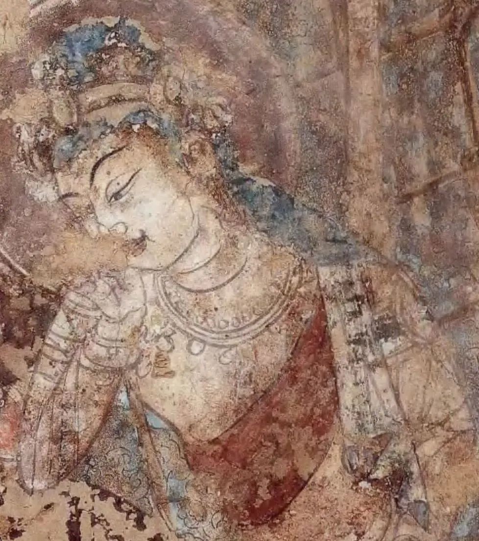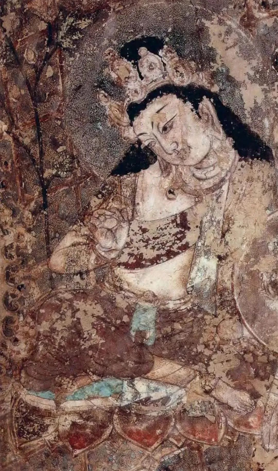 较下面一位思惟菩萨,宝蓝色长发,面容姣好,姿态自然,左手叉腰,右肘依托在右膝上,右手支颐沉思,表现出内心澄静与外表宁谧的完美统一。菩萨千年不变的微笑,正是对煌煌大唐的赞叹。这几位菩萨,身上都有很多装饰,头顶上都梳着高高的发髻,上面有宝冠;面相丰满圆润、曲眉秀眼、鼻梁高挺、朱唇微闭,每一位的神情姿态都不一样。上半身基本上是半裸,斜披锦帔,腰缠腰带,手臂上搭着透体的薄纱丝带。整个画面显得雍容华贵,体现出唐代当时以丰满为美的审美观念。右边最上面一位思维菩萨,交脚趺坐于伏瓣莲上,坐姿很随意。头戴宝冠,梳高髻,头发与其他三位的发色一样,是黑色的,分披双肩。面容姣好,身姿扭向一边,低着头,好像若有所思,又像在看右手手印,默默出神。