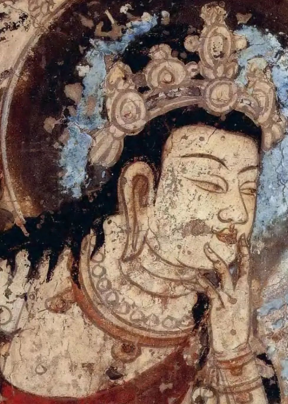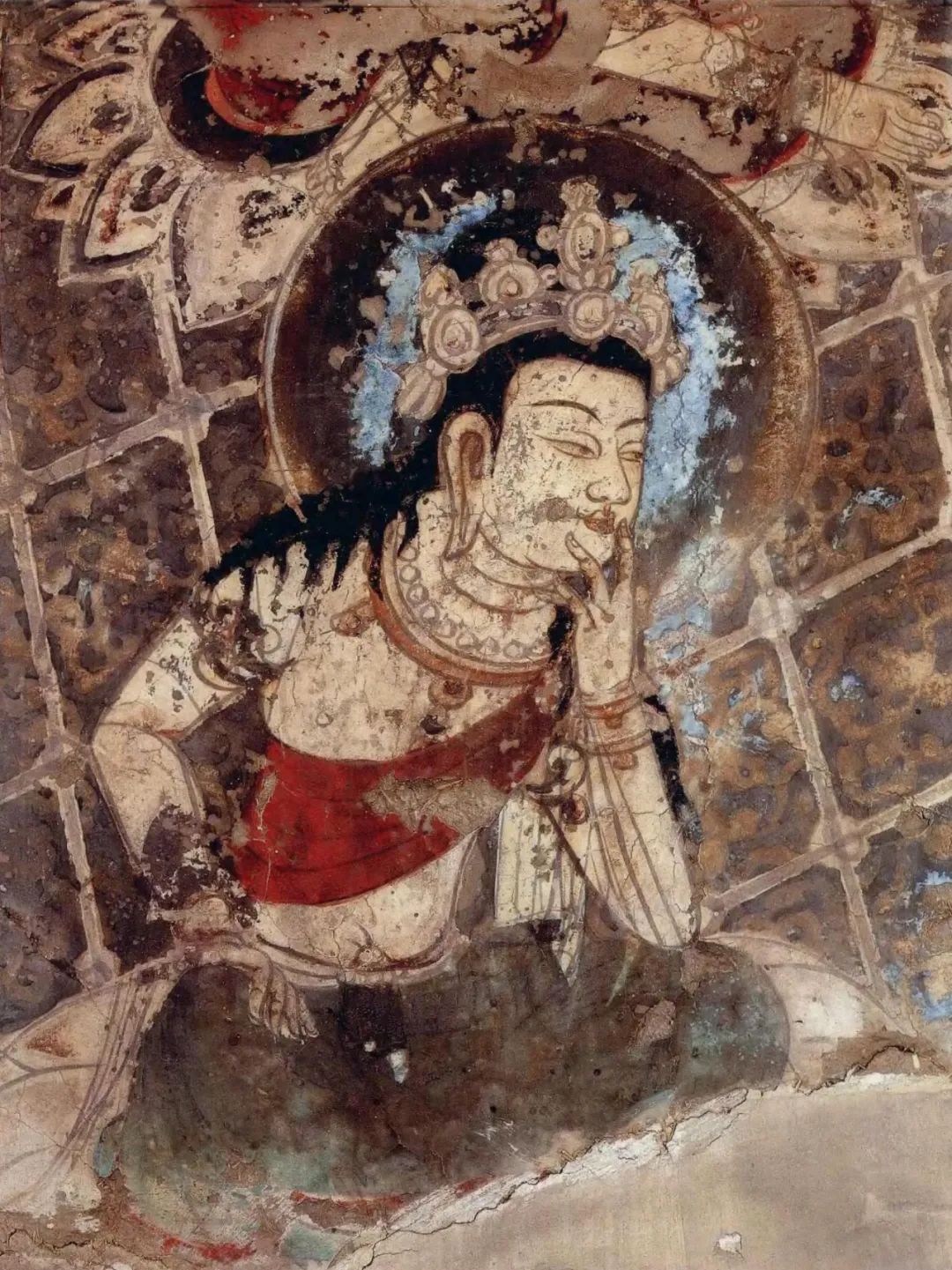 这一平台上主尊佛周围席地而坐的几位思惟菩萨:思维菩萨:位于主尊佛身边右侧的两位思惟菩萨,被认为是敦煌石窟里最美、最经典的菩萨之一。