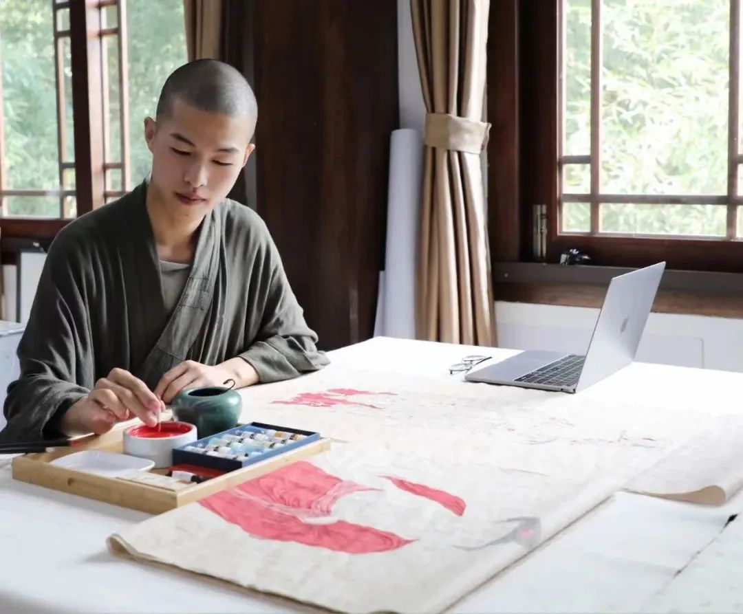 合青,字真严,号清安。1998年出生于湖北黄州,自幼跟随师父学习书画。2018年在云居山真如禅寺剃落出家。2020年毕业于杭州佛学院佛教艺术学院,同年考入杭州佛学院佛教人物画专业研究生,师从中国美术学院王一飞教授,主攻工笔重彩绘画创作与理论研究。
