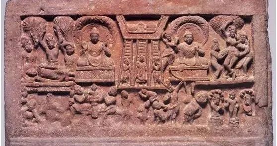 2015年8月初,“2015跨文化亚洲佛教艺术工作会议”在云冈召开,会上有韩国首尔大学教授李柱亨在介绍犍陀罗艺术的研究成果时,展示了一幅似为红色岩石雕刻的犍陀罗式佛教艺术作品(图2):画面上部中央正面雕刻了三道向上的阶梯,中央阶梯口雕刻佛陀立像,两侧阶梯口各立护法天王;三道阶梯的左右和下方布置表达佛陀“诞生”、“降魔”、“说法”、“涅槃”等四件大事的图像。显然,此石雕板所示内容为佛经故事“忉利天为母说法”。这是表现释迦牟尼佛上忉利天为母亲摩耶夫人说法后沿“三道宝阶”还下的故事,因而亦称“三道宝阶”。