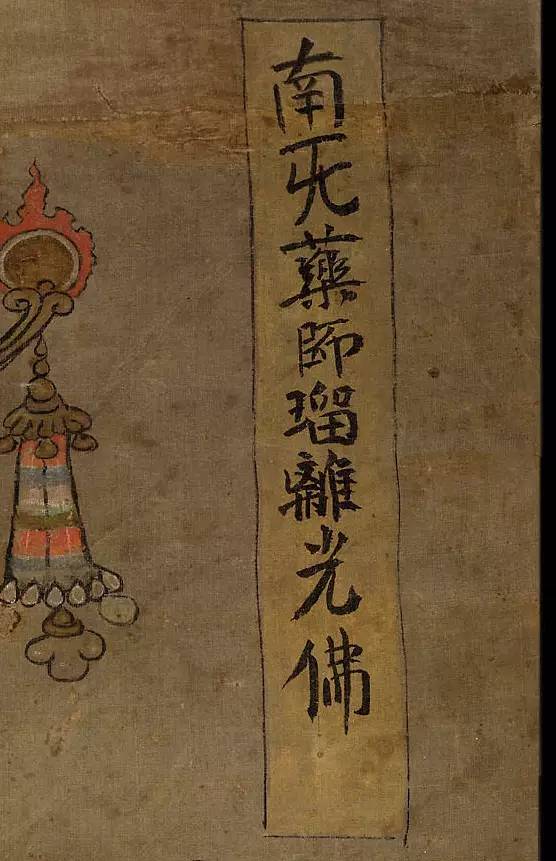药师琉璃光如来头顶宝盖,法相慈悲安详,仪态庄严,乌发肉髻,双耳垂肩,著红色佛衣,坦胸露右臂,右手上举胸前结印,左手膝前捧药钵,双足跏趺于莲花宝座中央。右侧有锡杖安置于架上。此药师像是依不空译《药师如来念诵仪规》所绘。