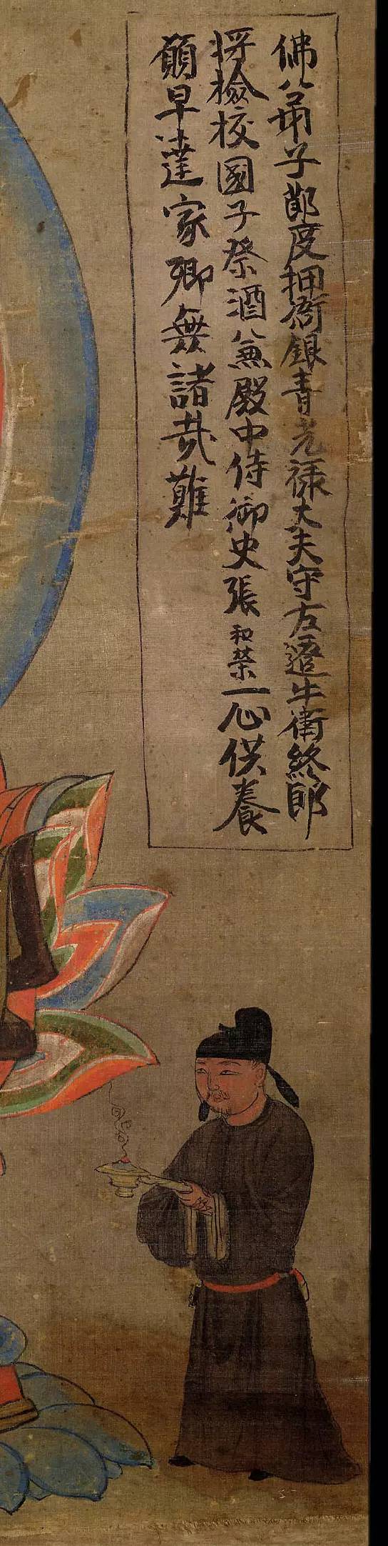 下方左右角各绘供养人,右侧为女,榜题“佛弟子彭氏供养”;左侧为男,其上方榜题为:佛弟子节度押卫银青光禄大夫守左迁(千)牛卫终(中)郎将检校国子祭酒兼殿中侍御史张和荣一心供养,愿早达家乡,无诸哉(灾)难。