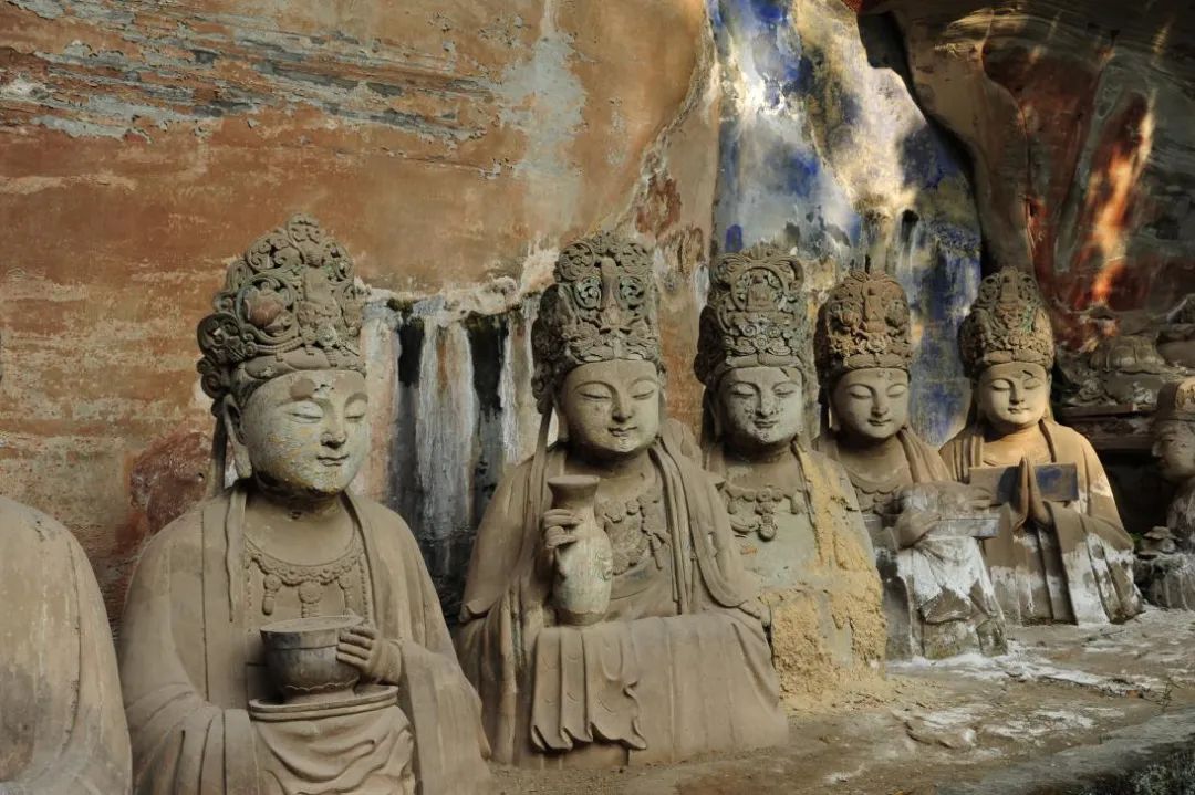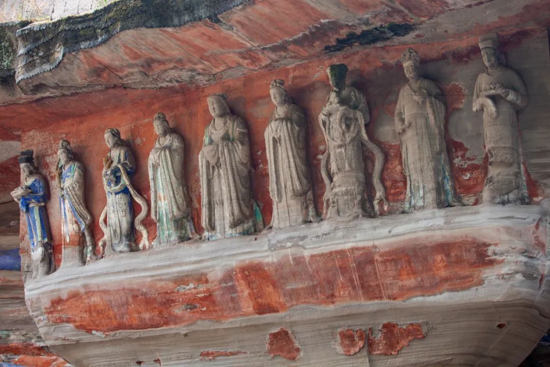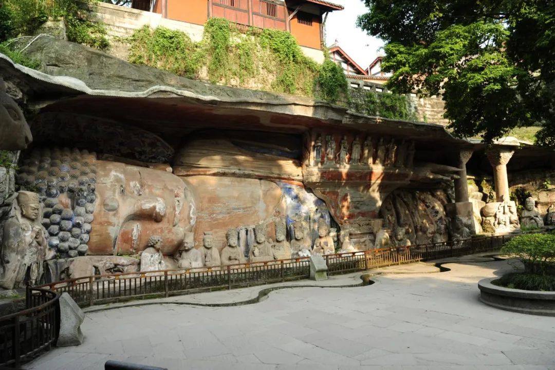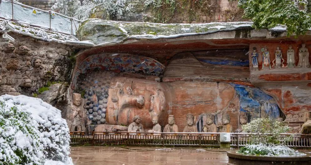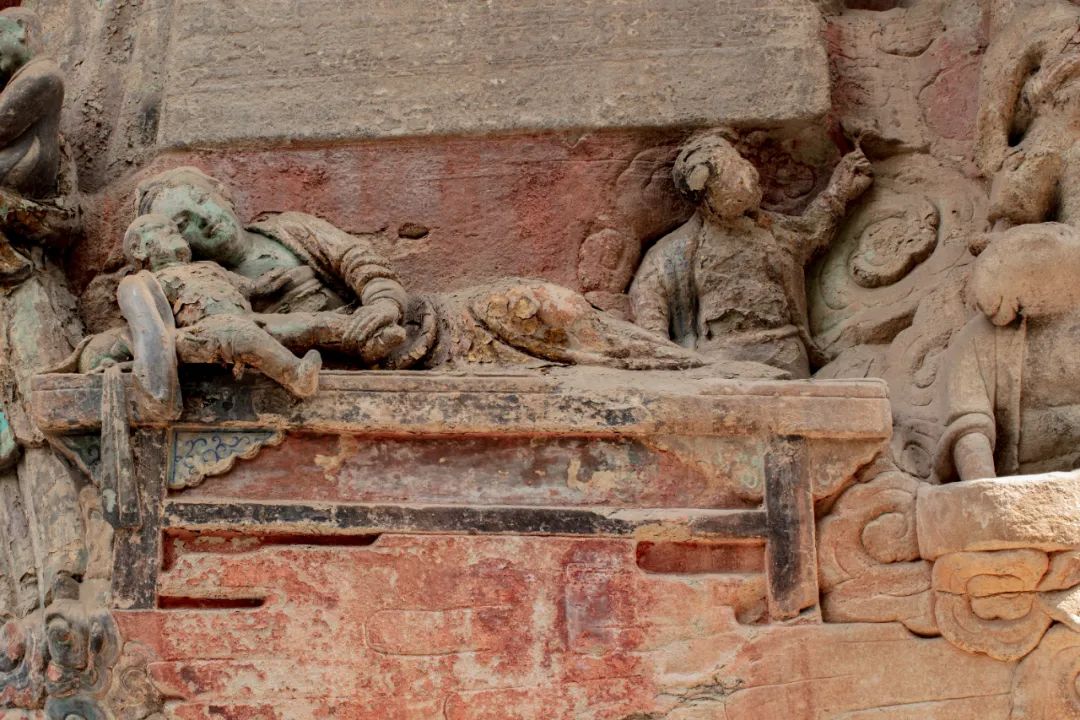 宝顶山大佛湾东崖段横卧一尊巨大的佛像,常称作“卧佛”,此即释迦牟尼的涅槃像。佛陀头朝北,面西侧身而卧。罕见的是,仅显上半身,膝盖以下隐于南面崖壁中,右肩部及以下身体也没入地中。即便如此,像身长达31.6米,显示肩宽6.7米。而全国最大的张掖大佛寺西夏涅槃像也不过34.5米长,何况还是完整的全身。像这样的半身涅槃像,在佛教造像中仅此一例。这是该尊涅槃像最大的独特之处。这尊涅槃像并不孤单,佛头部北崖转折处镌刻了“腋下诞生”和“九龙灌沐”两个画面;其脚伸向的南壁造像虽漫漶,里面能看到《佛传》中常见的“箭穿七鼓”“路遇死人”等内容。由此可知,大佛湾深处表现的是以涅槃像为中心的释迦传记故事。