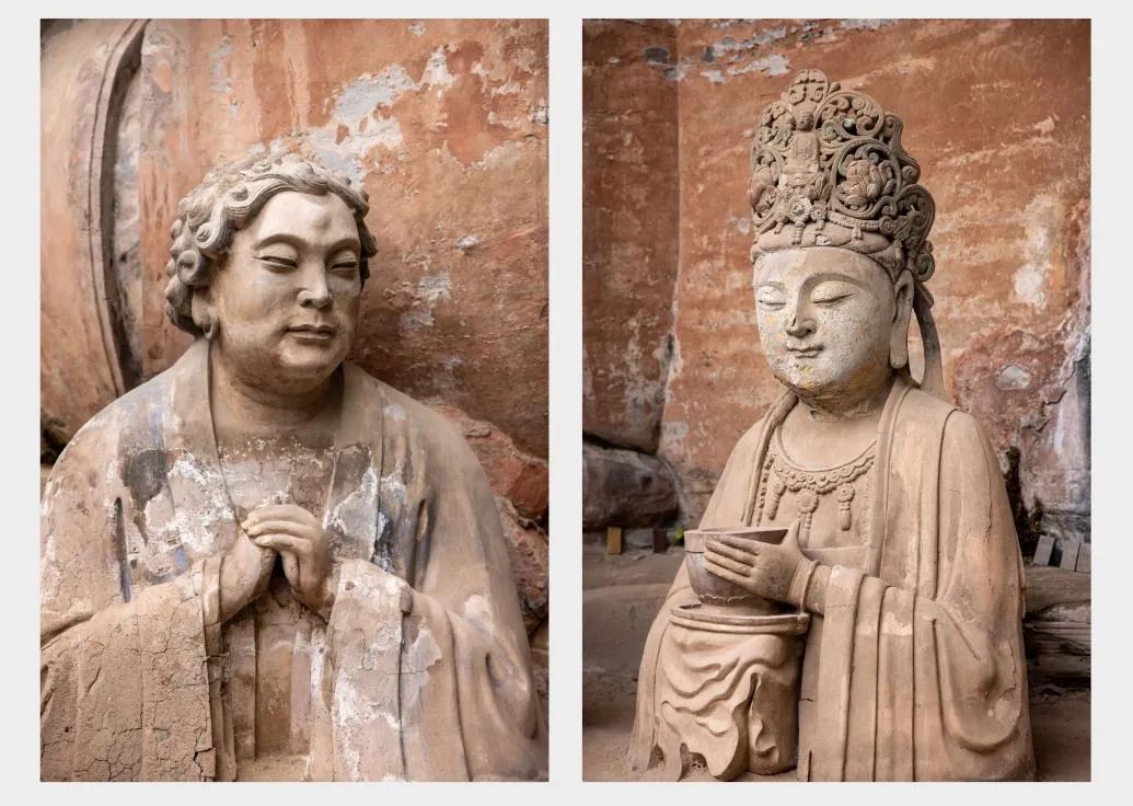 此龛涅槃像第二个独特之处是,其中没有一身弟子像。从印度古犍陀罗、中亚到中国遗存的历代涅槃系列图像中,围绕佛陀的人群之从来不会缺席弟子的身影,一般以迦叶、阿难为首的十大弟子为主,表现出悲痛万状的样子。这里我们看到的是菩萨、帝王、天王及世俗人物等。