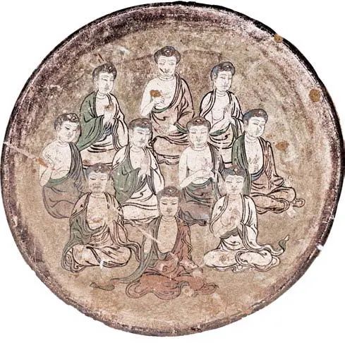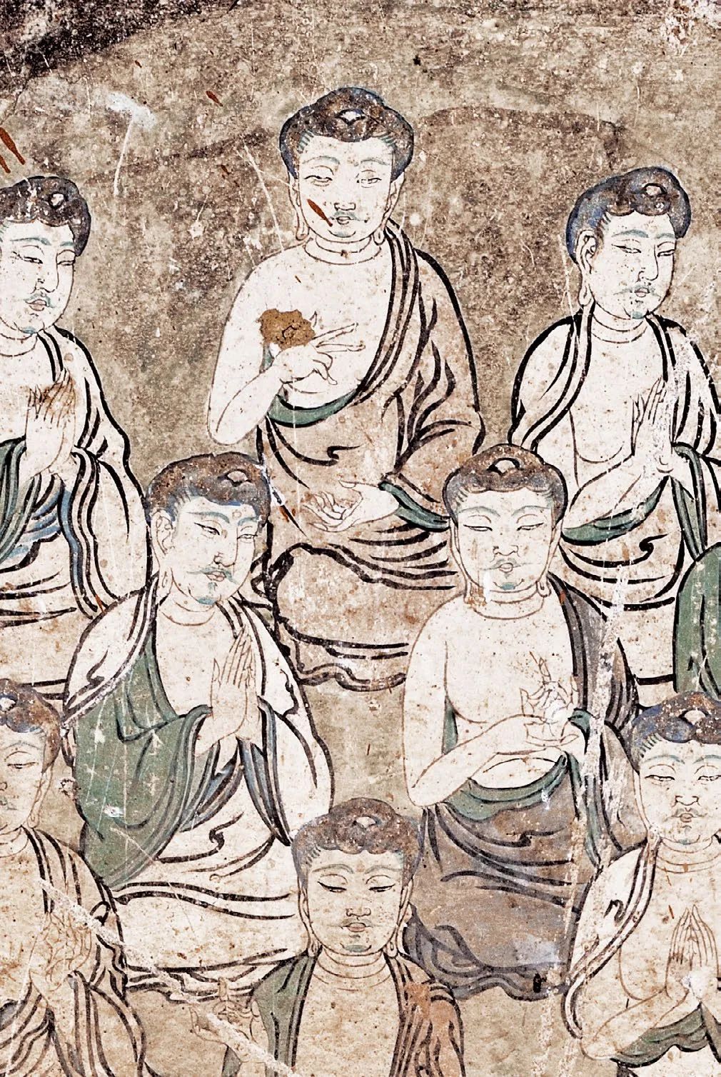 诸佛坐姿亦不一,或侧身而坐,或倾身而坐。画面施色,以青、绿为主色调。