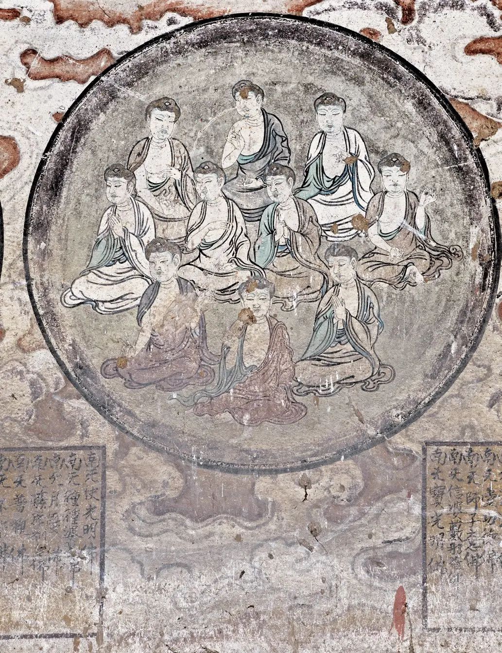 此二幅壁画绘于佛光寺东大殿前槽明间和南次间的栱眼外侧,每幅绘八个圆光,每一圆光内绘十身结跏趺坐佛像。每一圆光下侧,均有墨书题记,并用方框四周框起,方框内文字为每尊佛的佛号。