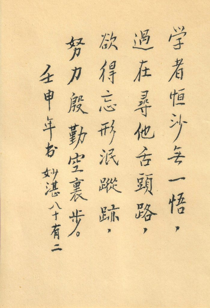 饮水思源,妙老德业昭著,以其汪洋之法量,妙相之朴拙,湛圆之心境,利世之悲愿,行人所不能行,舍人所不能舍。其德巍巍,感召十方。祈愿妙老乘愿再来,广度有情。