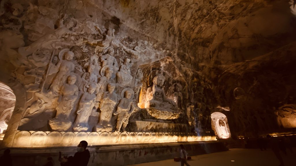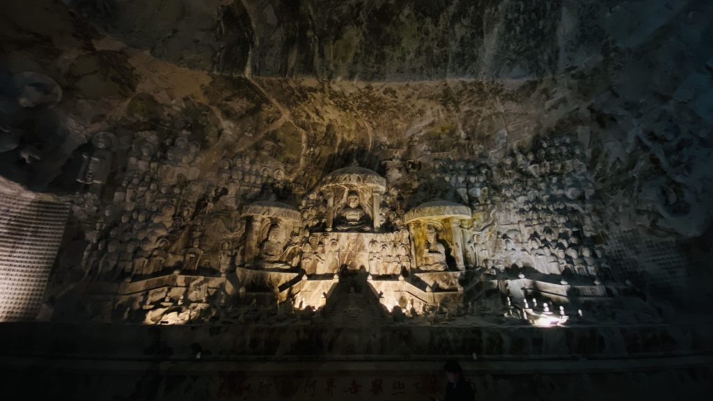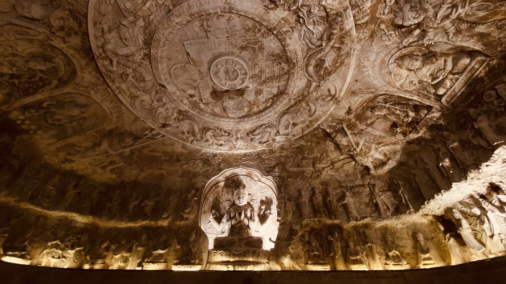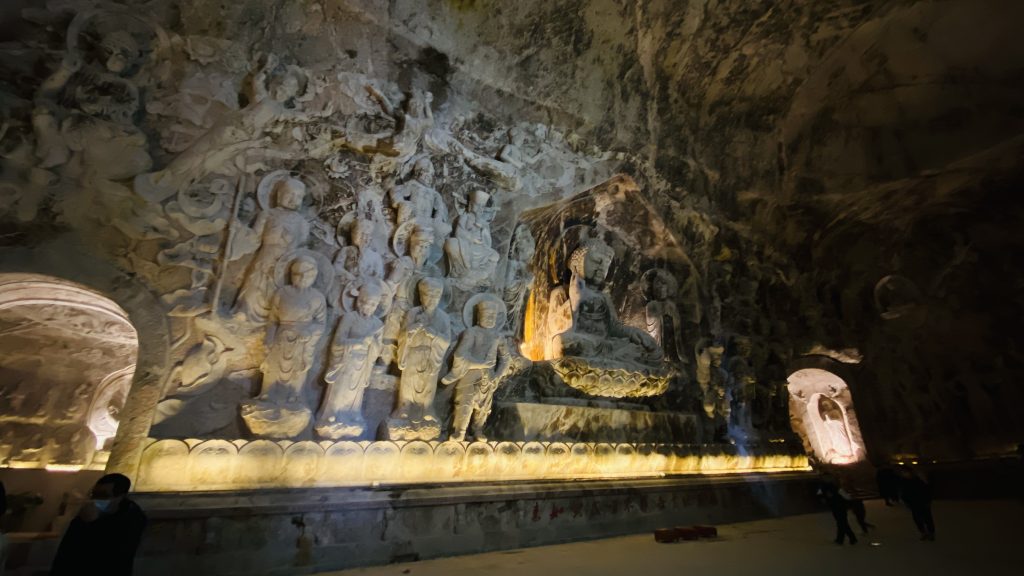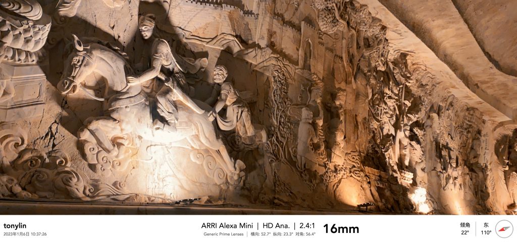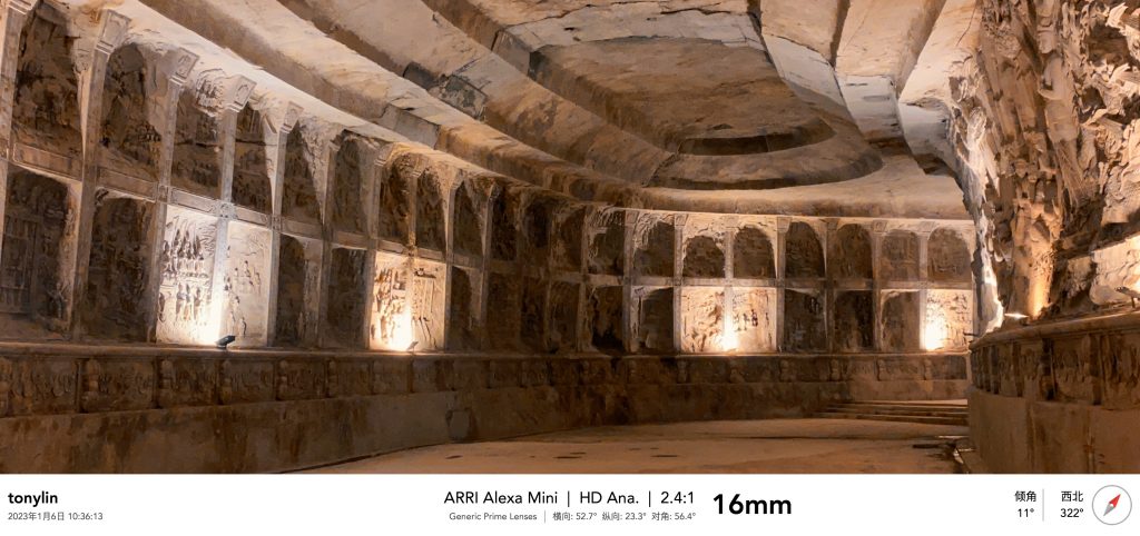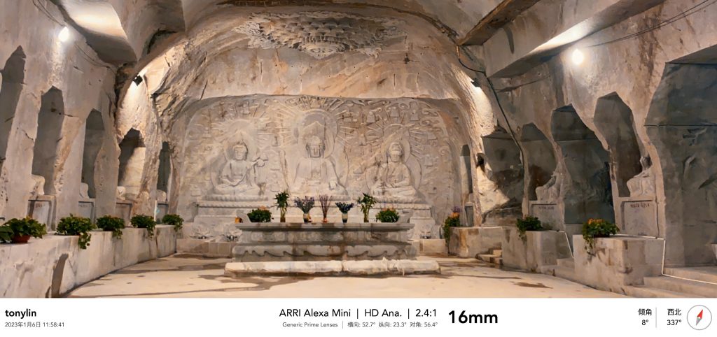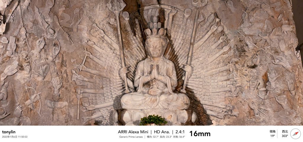 合掌岩主窟是一个高十五米、宽三十八米、深三十六米的大厅,这个一千三百平方米的洞窟中,四面石壁和穹顶上分别雕刻着东方琉璃世界、南方欢喜世界、西方极乐世界和北方莲花世界的巨大塑像群。合掌岩石窟由花岗岩雕刻而成,是单体石窟。洞内的佛像最高达8米,最小到2公分,石窟内外雕塑总面积1万多平方米,大小佛像逾万尊,已初步成型。