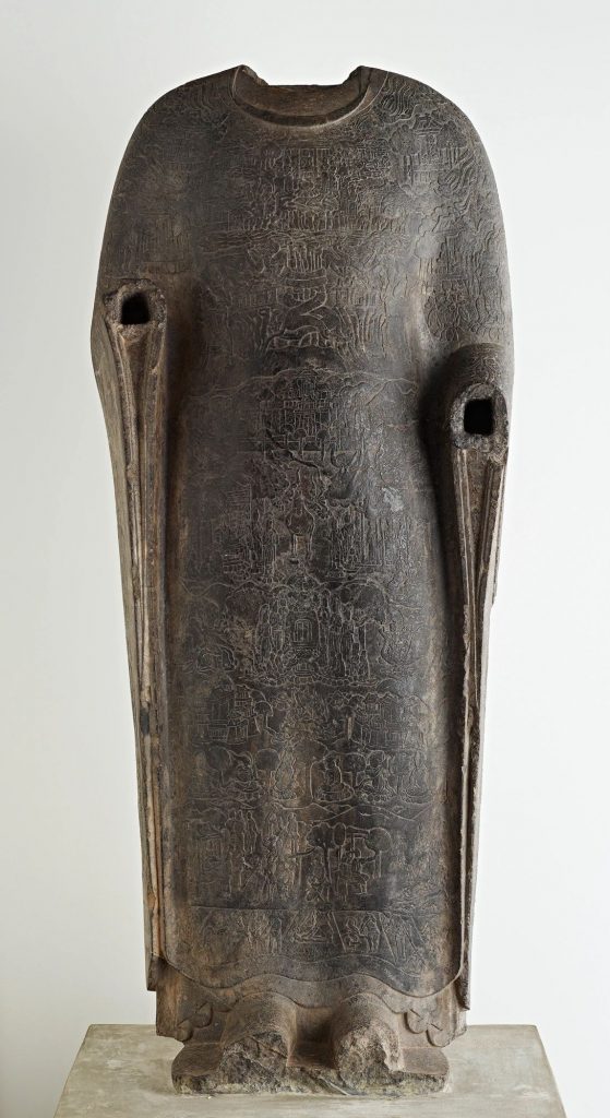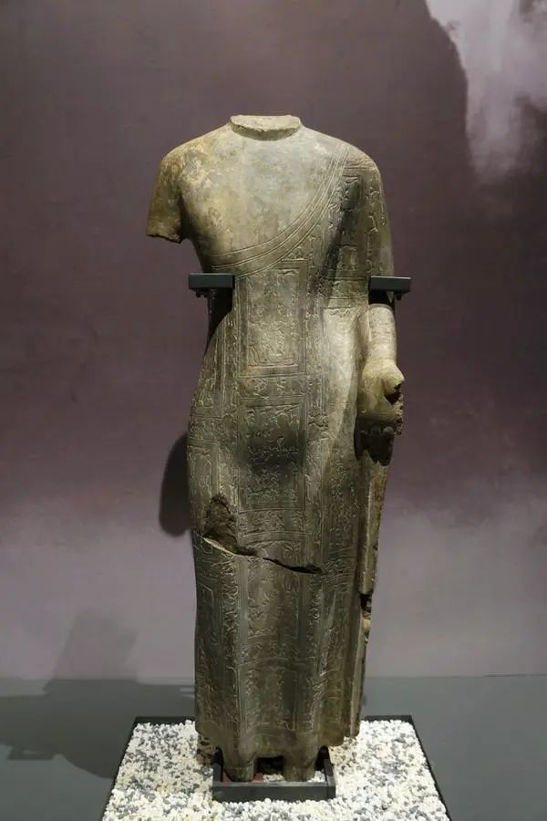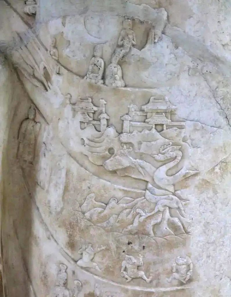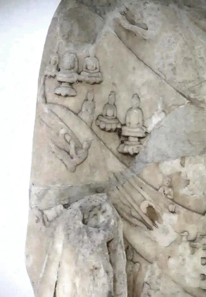 此像头手足已残缺,刻画袒右袈裟,袈裟正面分成纵向三列的界格,每列再分四五格,界格内刻画图案。界格内画面先是用减低浅浮雕的手法可出画面,画面上再用阴线刻手法刻出人物细节。但此像似乎尚未完工,因为线刻部分只刻了几个人物,因此,要具体识读画面的详细内容有相当大的困难。仅从画面上大致内容判断,似乎是有关《华严经》中六道轮回经义的图像。