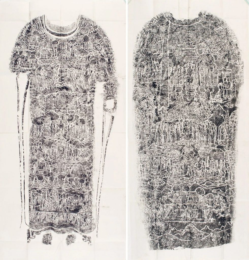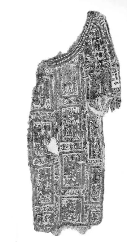 青州所藏与弗利尔美术馆藏略有不同。弗利尔美术馆藏法界人中像法衣上的图案形象之间没有整齐的界格,图纹大致能够区分出上下九层,布局紧凑而灵活。而青州所藏法界人中像法衣上刻有明确整齐的界格,界格内刻画图案。