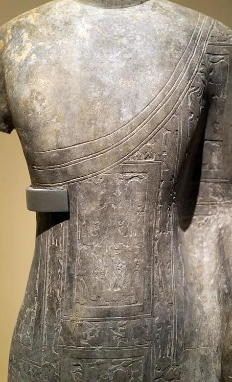 在弗利尔美术馆的众多佛像中,有一尊残缺佛头的立像非常引人注目。佛像表面上布满了精美的图案,图案有宫殿楼阁和说法图,还有似乎是维摩诘经变图。当时还不知道这就是罕见的“卢舍那佛法界人中像”,仍忍不住从上到下、从前到后把图案拍了个遍。