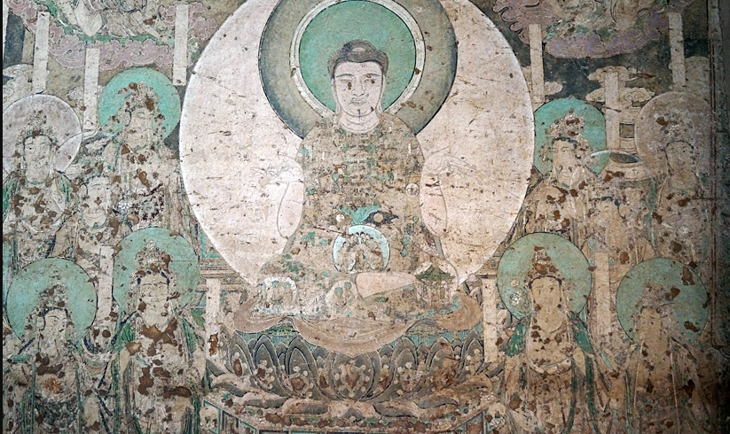 东壁壁画毁损比较严重,有资料说内容可能是《大方广佛华严经》的佛传故事。东壁南侧一组可以识别出是“卢舍那法界人中像”。佛像为坐佛,手印比较特殊。法衣上的图案没有界格,依稀可分三组,上面一组似乎是宫殿园林,中间一组的主要图案是一个圆内九个人物围绕这一个禅坐的人,或许是佛传故事吧,遗憾的是能找到的资料都集中介绍西壁壁画,而少有介绍东壁壁画内容的,具体内容不明。