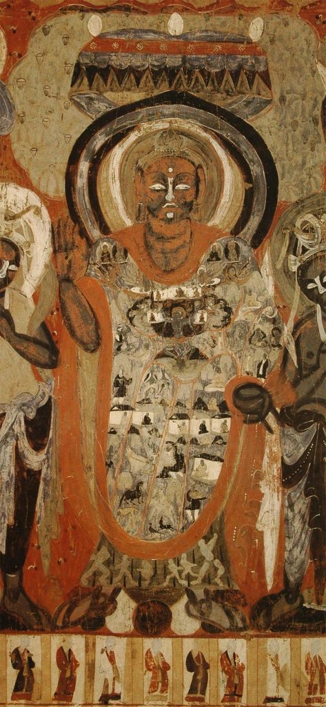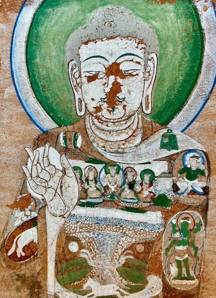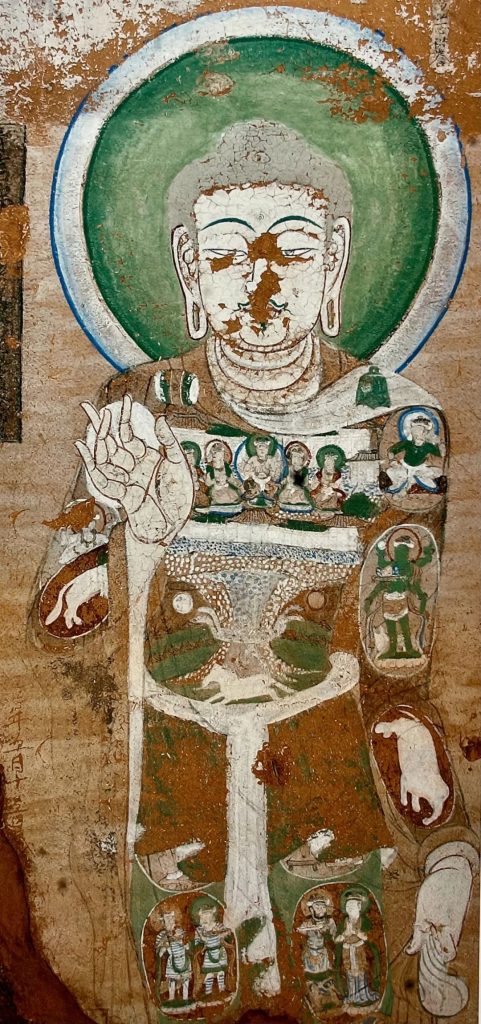 敦煌石窟第428窟南壁的这幅卢舍那佛,是莫高窟壁画中为数不多的几幅中最早、最好的一幅。大佛的袈裟,仿佛是透明的——里面透出的土红色线条,勾勒出大佛的身体轮廓;整个体内,呈现出各种奇景,包括三界(欲界、色界、无色界)及六道(天、阿修罗、人间、畜、饿鬼、地狱)的众生相。