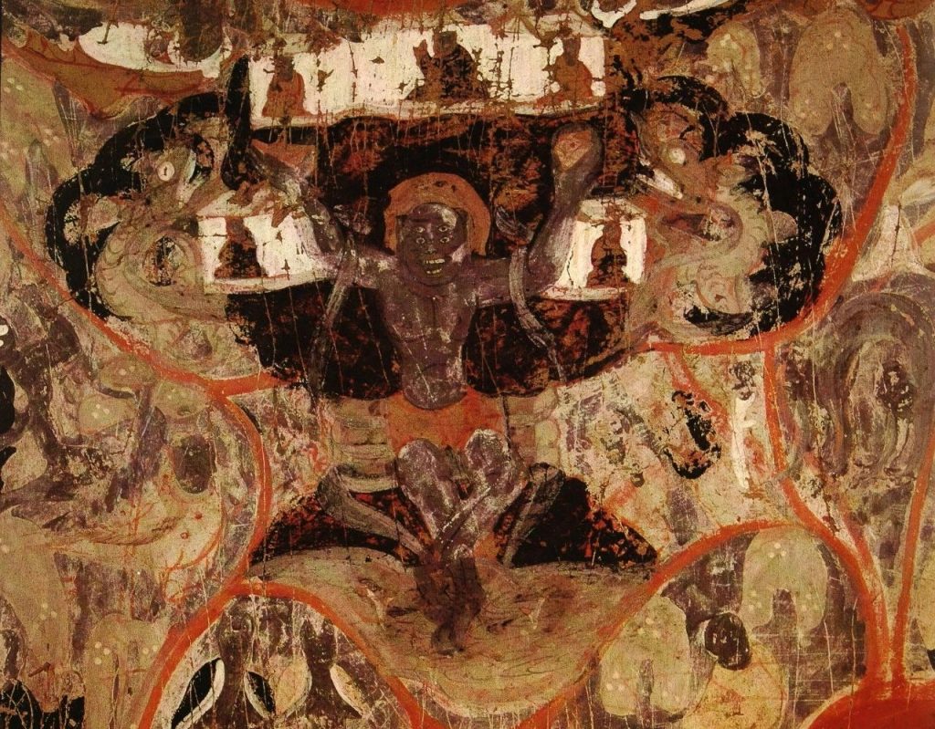 土红色线条,勾勒出的是佛陀身体(此处是前胸与胯骨)的轮廓线;轮廓线之内的不同区域,呈现出不同的景象(正如佛道两家的一个理念——“人体就是一个小宇宙”,“宇宙即人体”)。大佛胸前画须弥山,山顶五所宫殿内各坐一人,须弥山两侧各有一条龙缠绕。须弥山前,即大佛胸口处的巨人,是一位四目的阿修罗,裸上身,下着红色短裤,双臂上举,手托日月。这是阿修罗界。