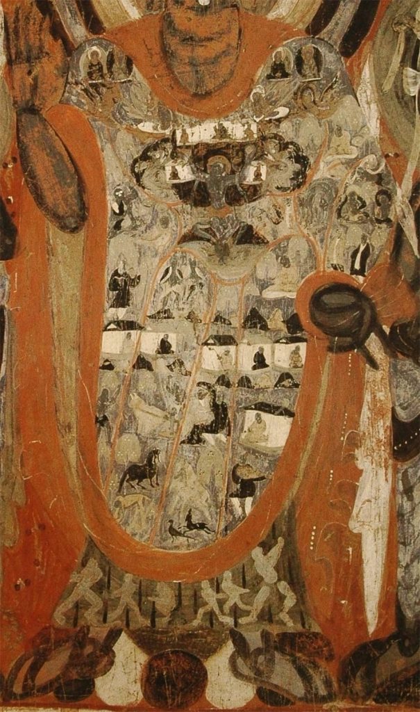 在两肩和胸部上方绘有佛、飞天和忉利天宫的天上界。胸部中央须弥山前画双手高举日月而坐的阿修罗,这是阿修罗界。下方是并列的山岳围绕着的房舍和衣着整齐的人物,这是人间界。再下方是半裸体的饿鬼界和鸟兽穿行于林间的畜生界。