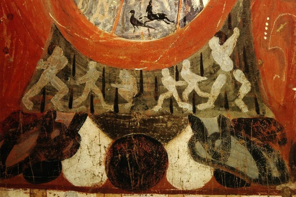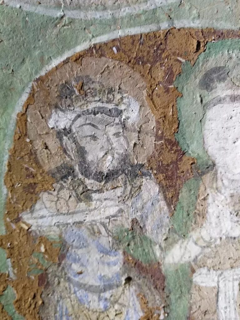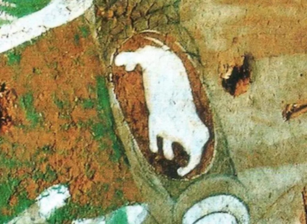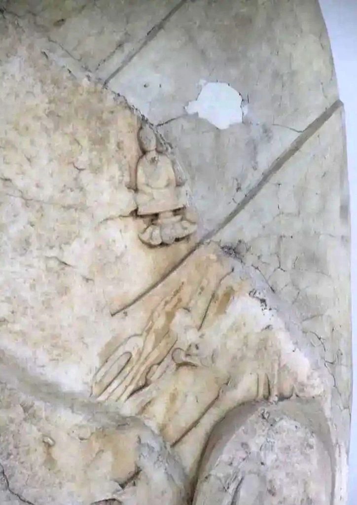 然后这个马的圆圈后头,他画了一个菩萨,这个菩萨可能代表天人的天道。还有一个圆圈,就挡在胳膊的袈裟的皱褶这里,因为他的手在上头把这儿挡住了,那个地方应该有一个地狱道之类的东西,所以说他画的是六道轮回的这样一个场景。