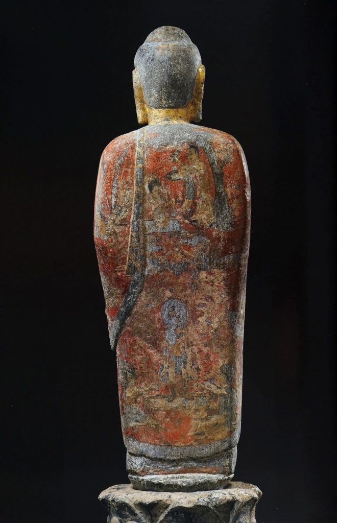 此尊佛立像是卢舍那法界人中像。其特征是佛身上以或画或刻的手法描绘出佛经内容,主要在表达《华严经》所说的“无尽平等妙法界,悉皆充满如来身”之意象,以阐明卢舍那佛的法身中,法界诸相无一不现的道理。此件卢舍那法界人中像跣足而立,右手施无畏印,左手执衣一角,佛衣上画有佛陀、菩萨、飞天、人、恶道等法界之图像,以流畅的线条勒出,再加上点金、彩绘,形成生动璀丽的图景,使观者在瞻礼佛陀之时,体味种种法界之深义。