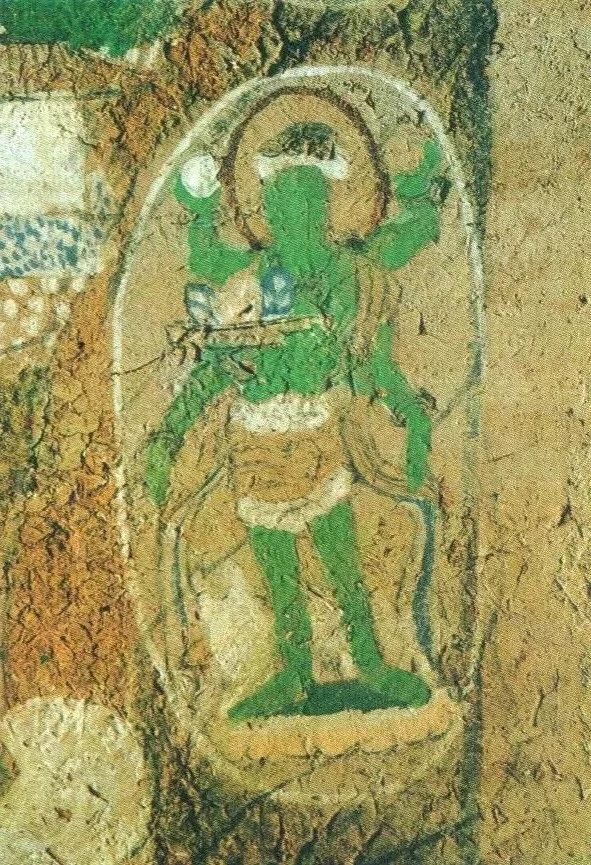 还有他画六道轮回的时候,画的特别有意思,这是在别的地方见不到的,他在胳膊上画了这么些圆圈,上面坐了一个人,表现人间,人下面他画了一个阿修罗,六臂,本来应该是三头六臂,可是这里他只画了一个头,更像个人,是绿颜色的,这是六道里头的修罗道。