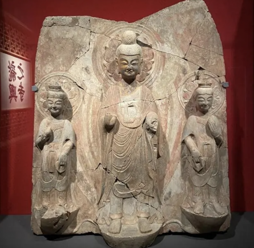 北魏晚期 贴金彩绘背屏式佛菩萨三尊像。