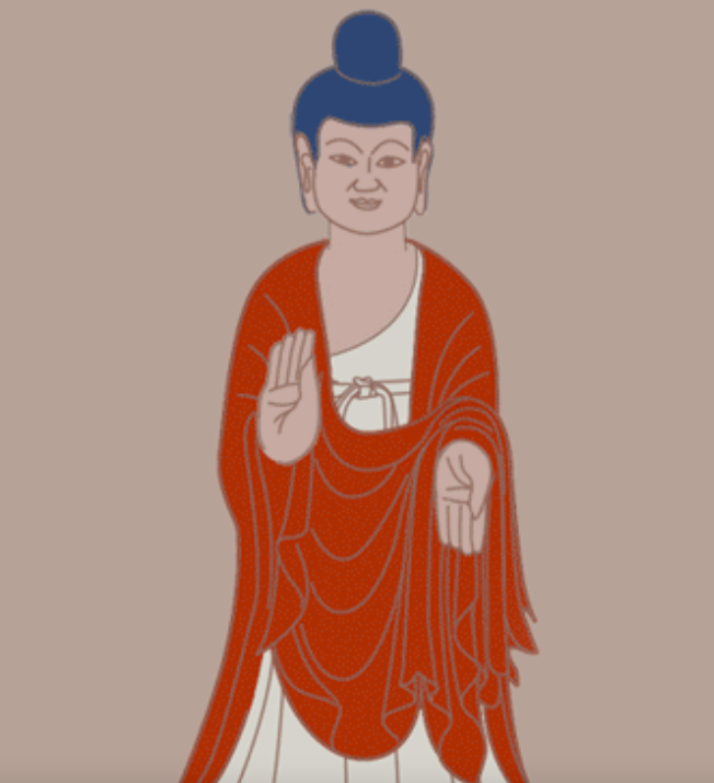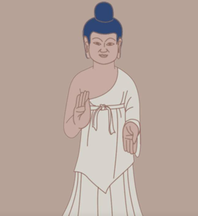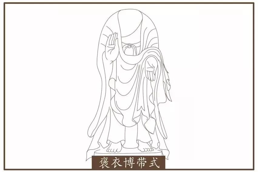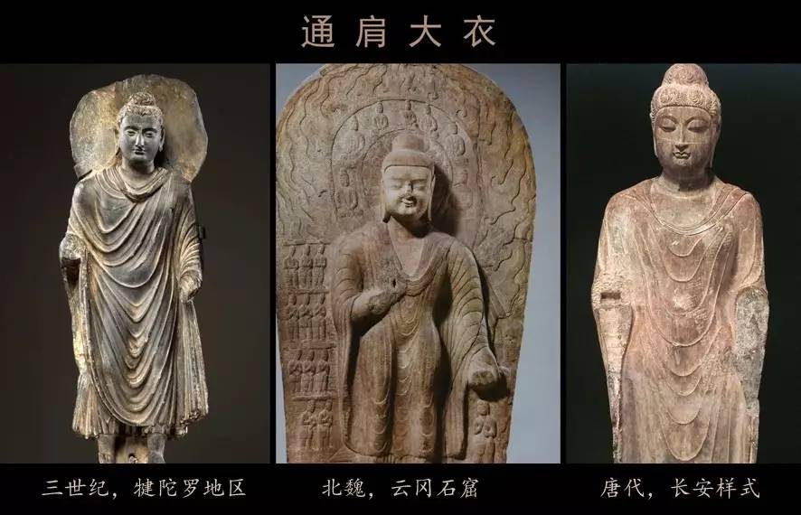 这种服饰来源于古印度犍陀罗地区,这是中国最早兴起的佛衣样式,也是汉魏两晋唯一的样式。特点是袈裟圆弧形领口,大衣从脖颈部一直下垂到腿部,结构简单,特征明显。