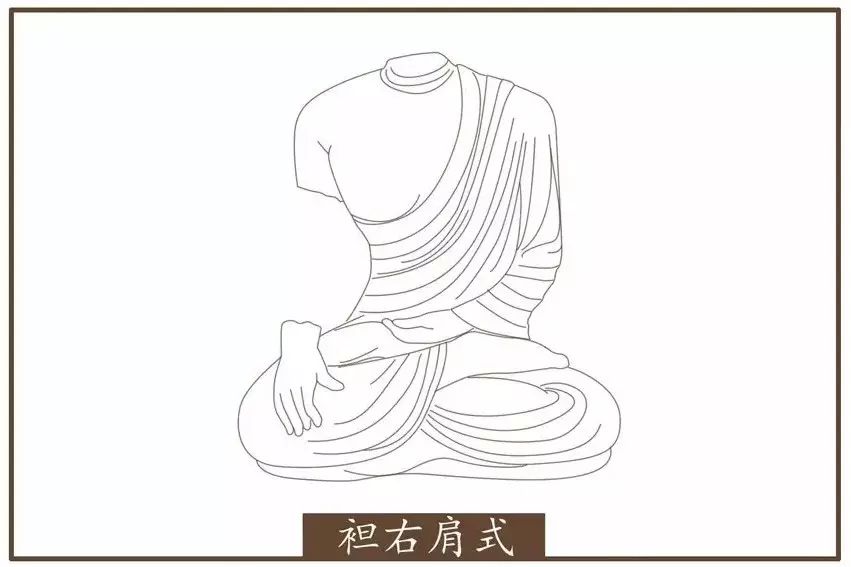袒露右肩,袈裟从左肩一直斜披至右胸部绕到背面。