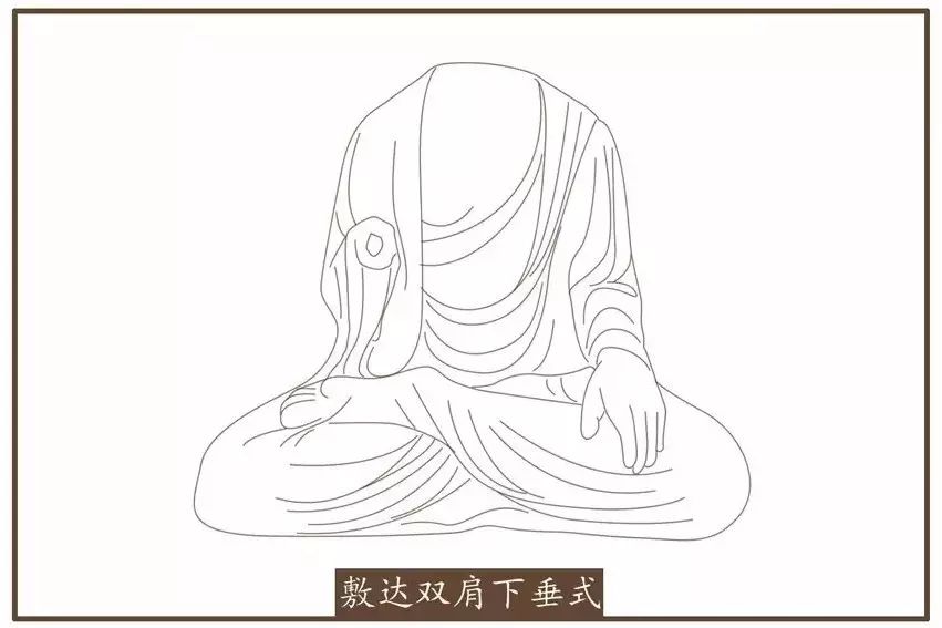 与半披类似,但垂领式佛衣的右肩袈裟直接下垂至右手的手腕,完全包裹了右手臂,视觉上感觉是用右手臂直接拉下来的袈裟袖子。