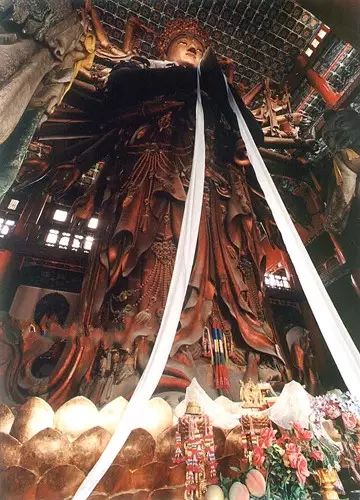 普宁寺位于承德市避暑山庄北部武烈河畔,大乘之阁内矗立着一尊金漆木雕千手千眼观世音菩萨,高达27.21米(为新测量高度,比原测高度22.28米多出近5米)重量为110吨,用木材120立方米,是世界上最高的金漆木雕佛像。该像建于1755年。世界文化遗产。