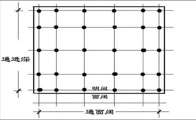 若干个单间面宽之和组成一栋建筑的总面宽,称为“通面宽”;若干个单间的进深则组成一座单体建筑的通进深