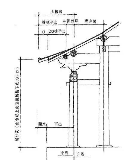 古建筑的上出大于下出,二者之间有一段尺度差,这段差叫“回水”,回水的作用在于保证屋檐流下的水不会浇在台明上,从而起到保护柱根、墙身免受雨水侵蚀的作用。