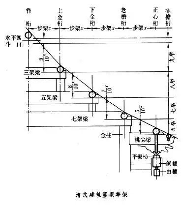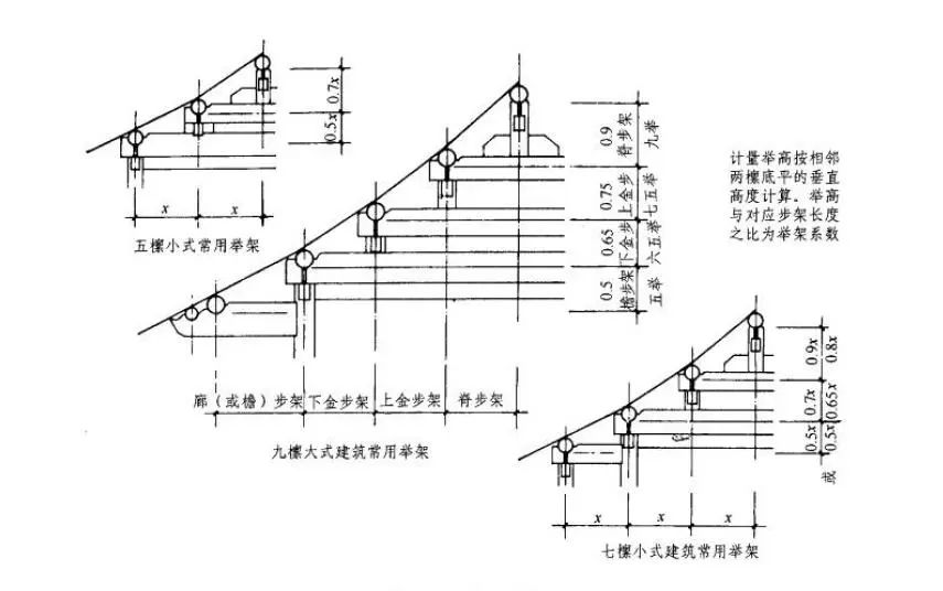 举架:所谓举架,指木构架相邻两檩中-中的垂直距离(举高)除以对应步架长度所得的系数,清代建筑常用举架有五举、六五举、七五举、九举等等。