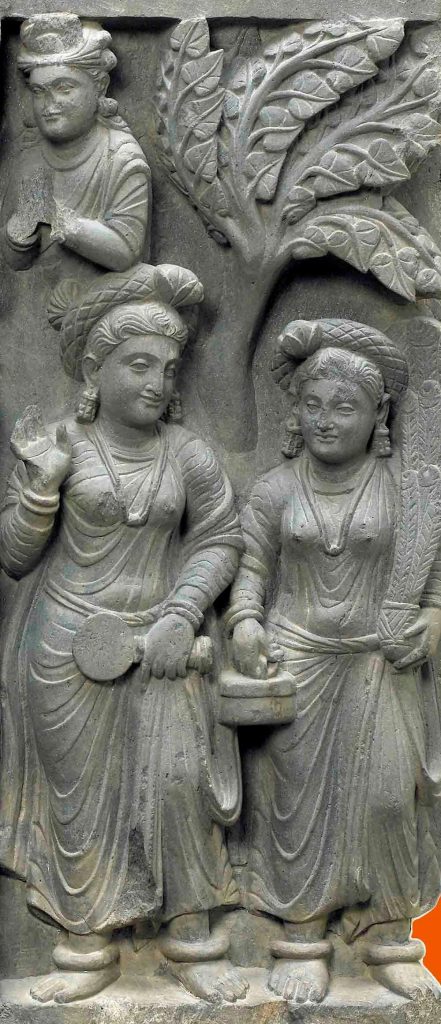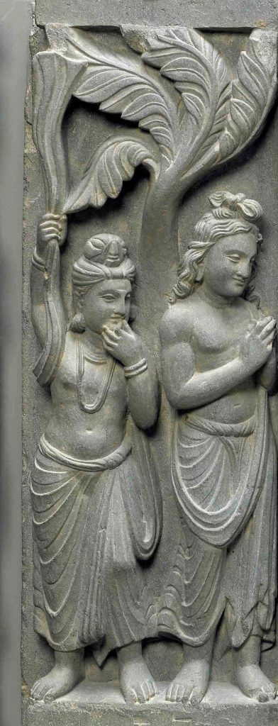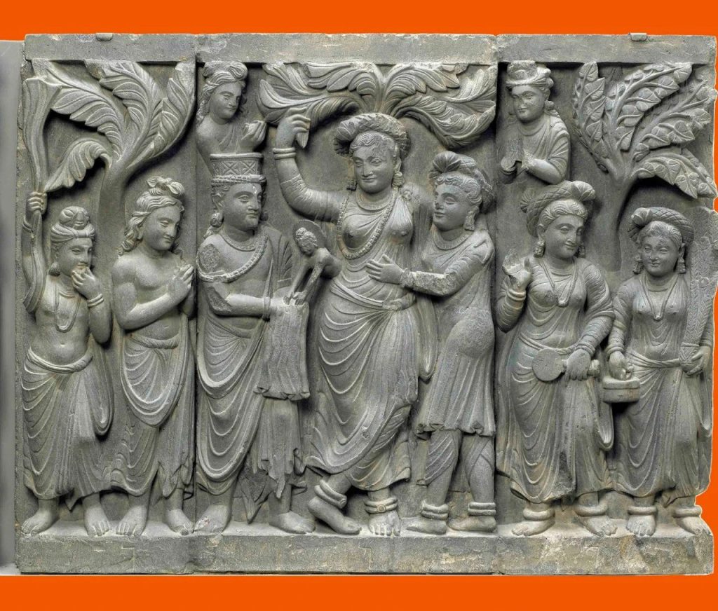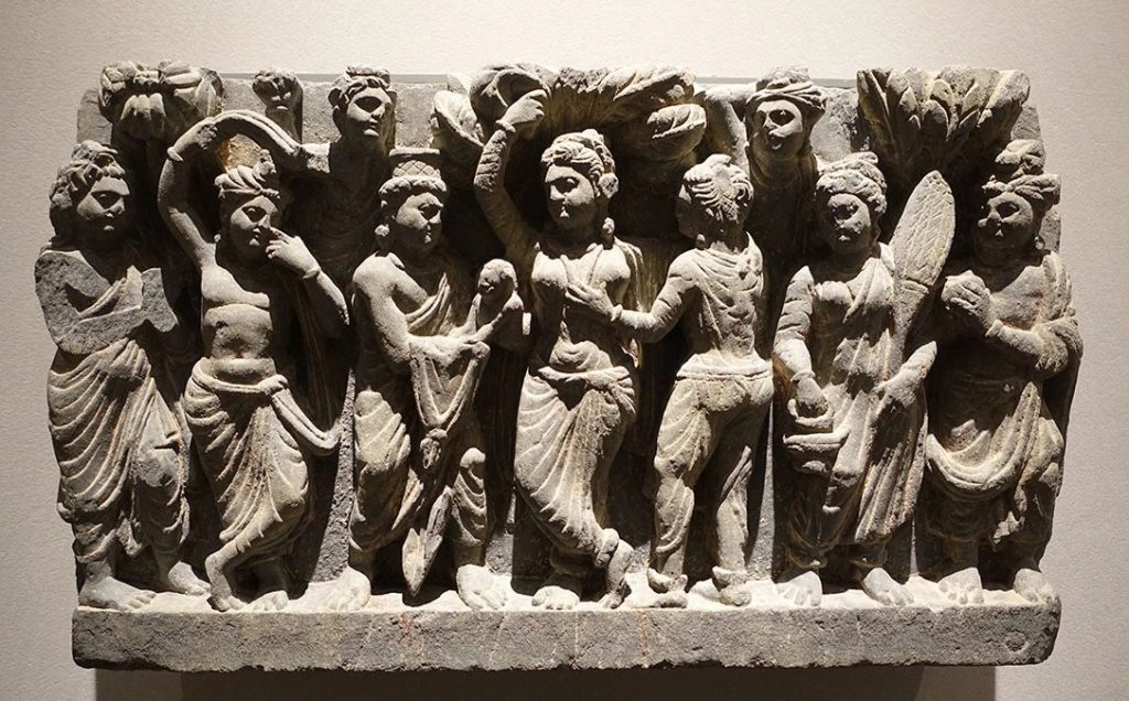 这尊雕刻精美的一千八百多年前的浮雕像是出自古印度贵霜时期的犍陀罗地区,上面雕刻的是佛母摩耶夫人在蓝毗尼花园无忧树下降诞太子的场景。