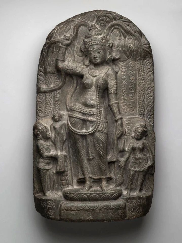 这是一件出自九世纪印度比哈尔邦那烂陀的浮雕像,上面生动刻画了佛母摩耶夫人在兰毗尼花园无忧树下降生太子时的场景;摩耶夫人头戴三叶花冠,发髻高隆,宝珠顶严,身佩各种项圈、耳珰、臂钏、手钏、足钏等珠宝璎珞饰品庄严全身,雍容华贵。手扶无忧树枝,身体左倾呈S形,自然优雅,赤足立于莲花宝座之上。在右肋下方,众神之王的因陀罗——释提桓因双手承接着刚出生的太子。