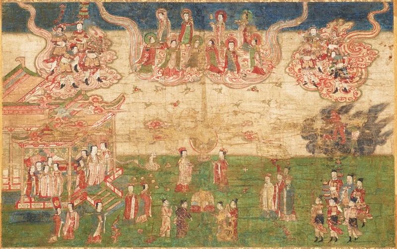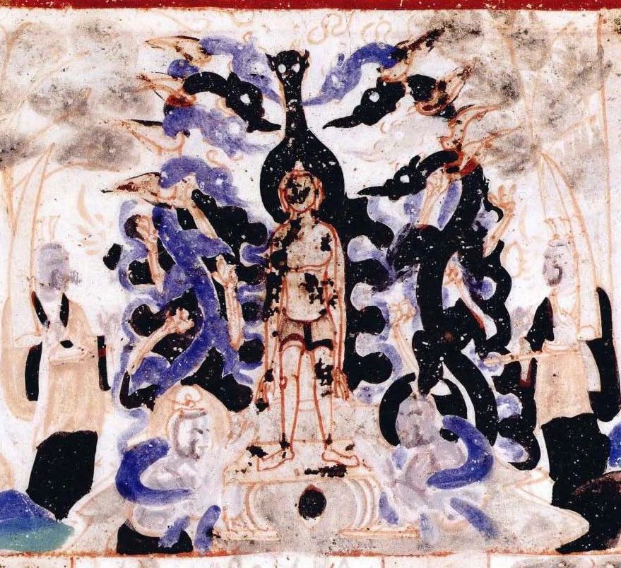 画面中央,站立刚刚出生的悉达多太子,九条龙围绕着他,由上而下喷吐出香水,为太子沐浴。两侧还有天神弹琴奏乐,熏香烧香。浴后的太子得以身心清净。