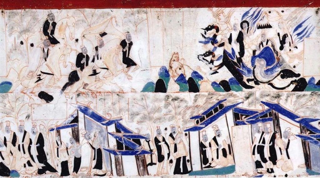 画面上部右侧,摩耶夫人抱着刚刚出生的太子,乘坐一辆四龙所驾驭的交龙车回宫,车右狻猊奔腾,车左右人身兽首的天神和弹奏箜篌的伎乐飞天围绕着。画面上部左侧五骑骑乘向着交龙车驰来,为首者戴王冠,其余四骑骑乘者为王者张持伞盖,簇拥相随。此表现净饭王闻讯喜得太子,便率百官出城相迎的场面。