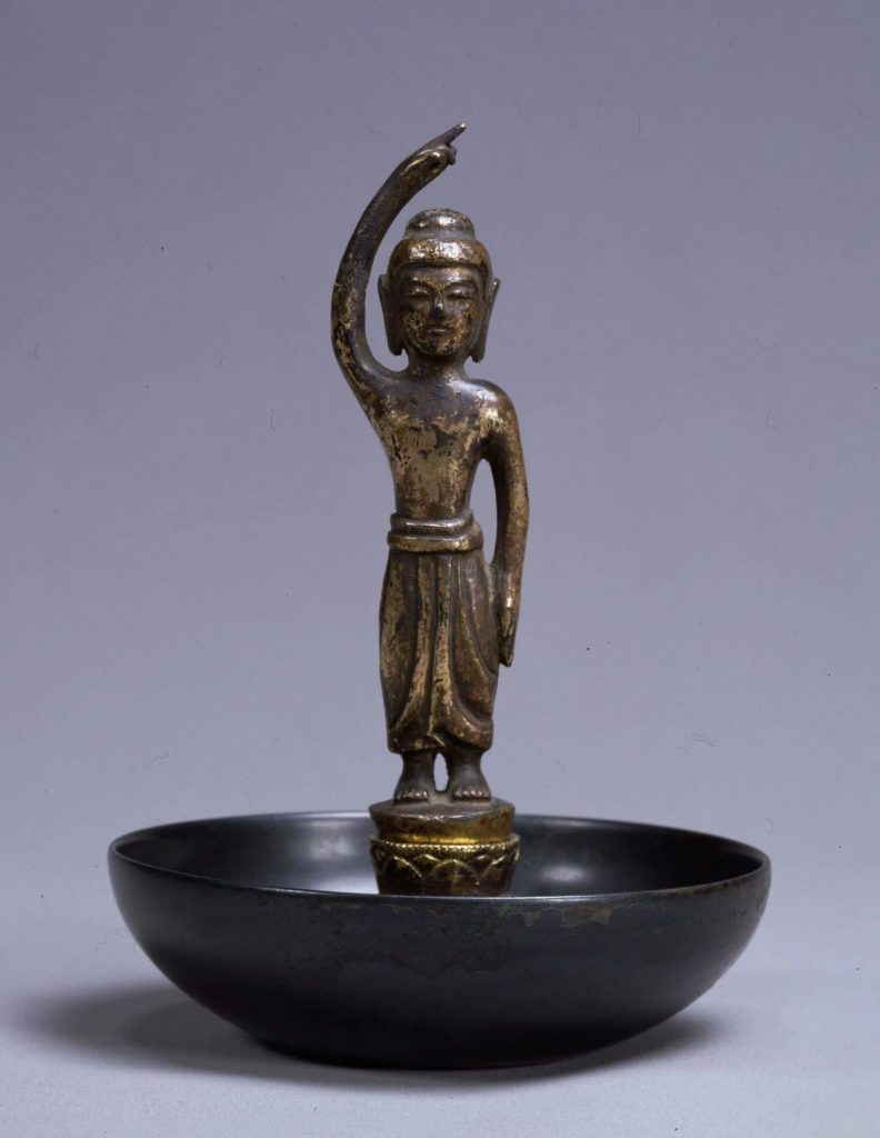 诞生释迦太子像,是作为四月初八“浴佛节”灌顶法会的本尊而制作的。这尊小巧可爱的佛像,表现了释迦佛诞生时候的场景,天真无邪的相貌和自然的躯体的表现是7世纪末金铜佛的特征。
