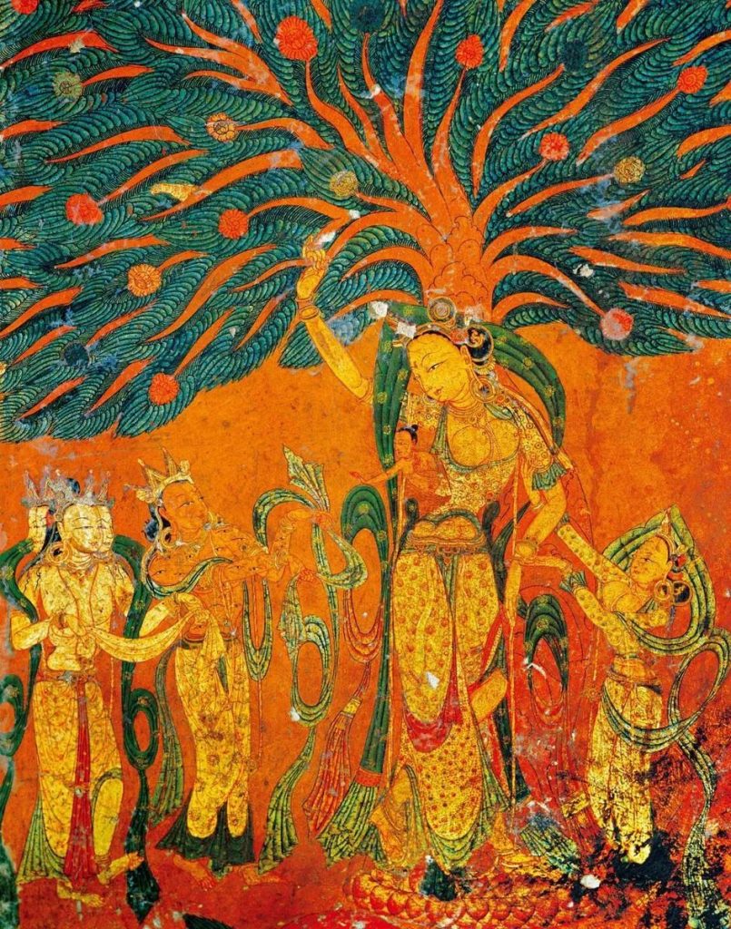 托林寺集会殿后殿残存的佛陀诞生壁画。佛教故事说,佛陀化身白象,投入迦毗罗卫国王后摩耶夫人之母胎。后来,摩耶夫人手扶无忧树枝站着,没有任何痛苦地,佛陀从她的右胁诞生。
