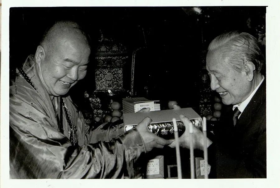 更值得一提的是,一九九四年四月二日朴老再次以八十七岁的高龄,专程在大师抵达南京的数天前,从北京搭乘十八小时的火车到上海,再换乘五个小时的火车赶到南京等候大师的到来,当两人互相行礼并紧紧握手的时候,星云大师深深地体会到了眼前这位老人的慈心和热忱。朴老非常重视这次的会面,他赠送给大师的礼品也别具意义,有金线织绣的“佛”字卷轴一幅,复印弘一大师亲笔书写的《药师如来功德本愿经》六册,中国佛协出版的《佛教嘉言书法集》一册和《中国佛教协会成立四十周年纪念文集》二册。其中,尤以他亲手书写的调《寄忆江南》一词,流露出对中国佛教的深切期许,使大师倍感弥足珍贵。