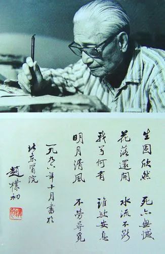 赵朴老一向崇尚俭朴,他在一所普通的四合院里度过了数十个春秋,木头院门涂著深色的油漆,早就剥落了,后院的两间房子是朴老平时布置的佛堂和书房。房间都不大,所有的空间几乎都堆满了书,墙上有几幅字画,其他都是朴老参加各种佛教活动的照片。书房现已腾出来作为灵堂之用,东面的墙上是一张朴老九十岁时拍摄的照片,旁边贴著朴老遗嘱中的一首诗: