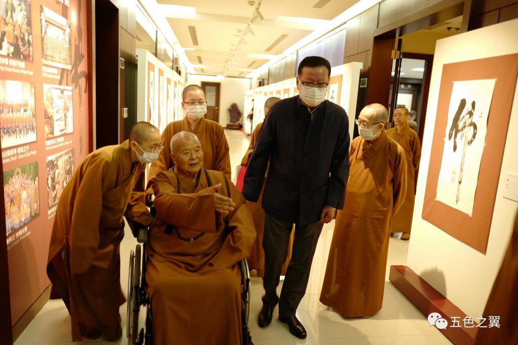 2018年10月4日,在佛光山,星云大师陪同刘长乐观看大师一笔字书法展
