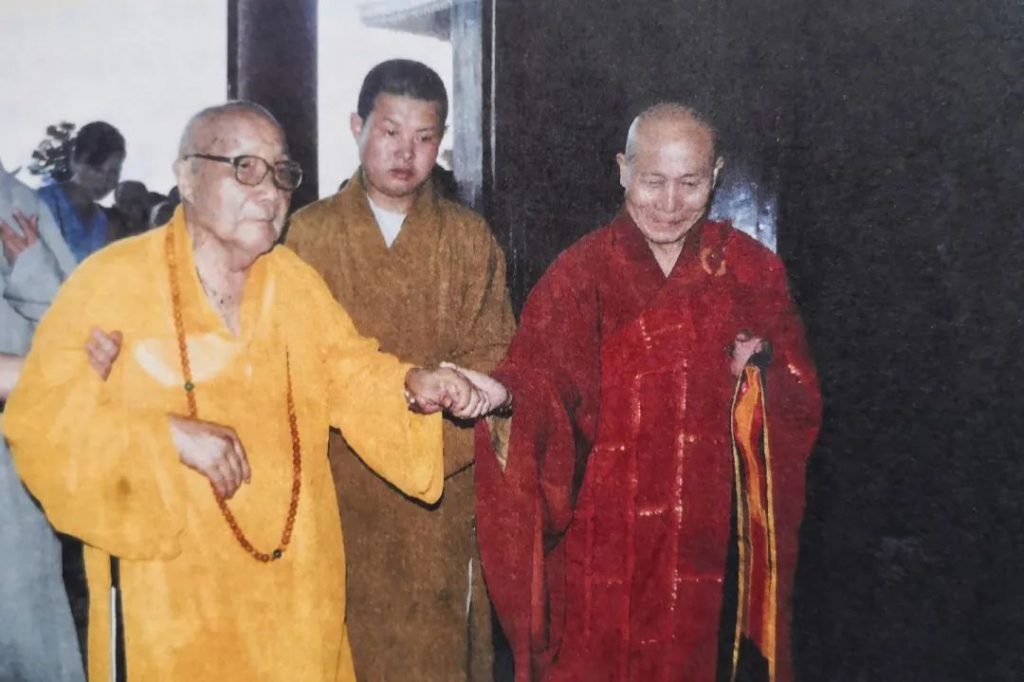 1989年,中国台湾佛光山星云大师首次回大陆探亲弘法,参访成都宝光寺(前排:净天长老左二、净慧长老左四、清定上师左五、星云大师中)