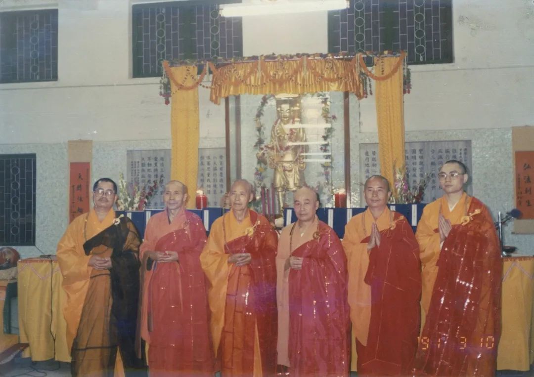 1988年10月30日,四川成都宝光寺遍能大和尚升座法会(果忍老和尚左一、净天长老中、乐山乌尤寺镇元法师右一)