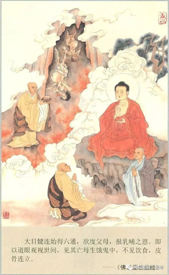 目犍连见此,悲哀涕泣,求助于佛陀。佛陀让目犍连在七月十五结夏安居圆满这一天,以百味饮食安于盂兰盆中,诚心供养十方僧众。