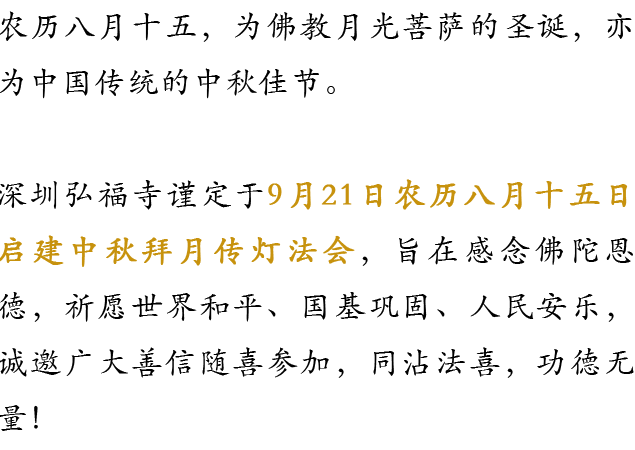 传灯 | 深圳弘福寺中秋拜月传灯法会 编辑:泷中 • 2021年9月16日 上午11:57 • 法讯 来源:深圳弘福寺 2021-09-16 法会时间 9月21日 (农历八月十五日) 法会安排 16:30—20:00 拜月传灯祈福法会 请长按上方二维码 在线登记 本网站属于非赢利性网站,转载的文章遵循原作者的版权声明,如有版权异议,请联系值班编辑予以删除。 联系方式:0591-83056739-818 18950442781 赞 (0) 编辑:泷中 0 0 生成海报 杭州云林公益基金会开展中秋慰问活动 上一篇 2021年9月15日 下午2:59 云台禅寺常住到放马场礼祖并看望住山法师 下一篇 2021年9月16日 下午12:01 相关推荐 法讯 盂兰盆丨山东大灵岩寺2021盂兰盆法会通启 000 编辑:泷中 2021年8月11日 法讯 华严丨大相国寺即将举行“辛丑年华严共修法会” 200 编辑:泷中 2021年7月19日 法讯 授三皈依丨二祖匡教寺启建农历六月十九传授三皈依法会通启 200 编辑:泷中 2021年6月20日 法讯 佛七 | 江苏无锡福慧寺「念佛生心」2021年法会通启 400 编辑:泷中 2021年7月4日 法讯 佛七丨山东菏泽三源寺2021年7月1—7三源寺庆党百年华诞佛七共修 300 编辑:泷中 2021年6月24日 法讯 法会丨普光寺农历六月十九观音菩萨成道纪念日祈福法会通启 400 编辑:泷中 2021年7月10日 法讯 禅修丨上海嘉定区响水灌河禅寺2021暑期三天居士学习班招募 200 编辑:泷中 2021年7月6日 法讯 法讯|辛丑年二祖寺盂兰盆法会通启 000 编辑:泷中 2021年8月19日 法讯 禅七 | 浙江杭州南山讲寺2021年8月地藏禅七活动 000 编辑:泷中 2021年7月28日 法讯 佛七丨四川达州渠县龙华寺2021年国庆精进念佛法会通启 000 编辑:泷中 2021年9月22日 发表回复 您的邮箱地址不会被公开。 必填项已用 * 标注*昵称: *邮箱: 网址: 记住昵称、邮箱和网址,下次评论免输入 提交