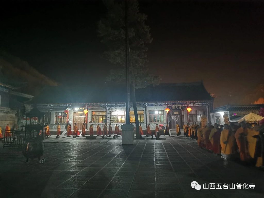 五台山普化禅寺内梵音缭绕,檀香袅袅,四众弟子虔诚备至,威仪具足。绕寺一周,迤逦而行,一路高唱梵咒,晓喻群灵。