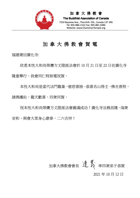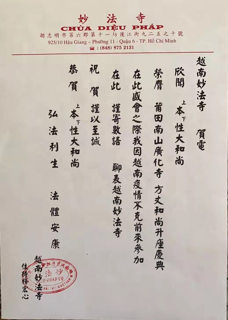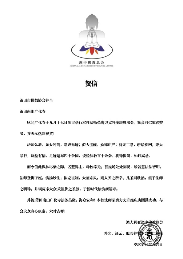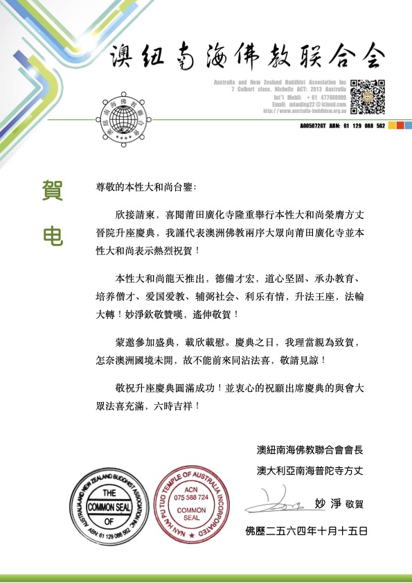 澳纽南海佛教联合会、澳洲南海普陀寺暨妙净大和尚贺函