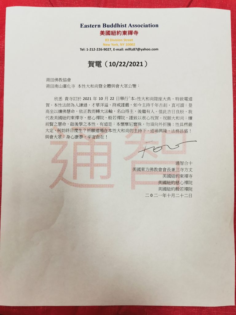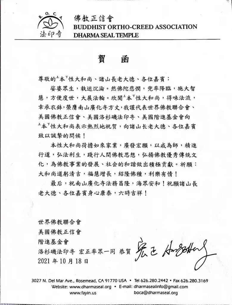 美国佛教正信会、洛杉矶法印寺暨宏正大和尚贺函